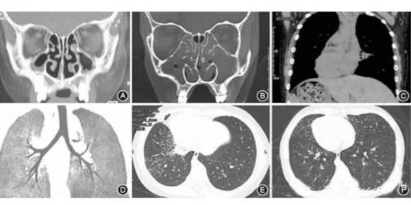 图 7 患儿影像学检查结果。A:鼻窦CT示双侧上颌窦炎(男,11岁);B:鼻窦CT示双侧上颌窦炎和鼻中隔偏曲(女,11岁);C:CT冠状位成像可见左肺局部肺不张、右位心和腹腔脏器反位(女,11岁);D:CT气道重建可见气管左右结构反位(女,10月龄);E:右肺CT可见较多小叶中心型微结节(女11岁);F:双肺CT可见支气管扩张和细支气管炎(男,11岁). (引自靳雨婷等,中华儿科杂志, 2015 )